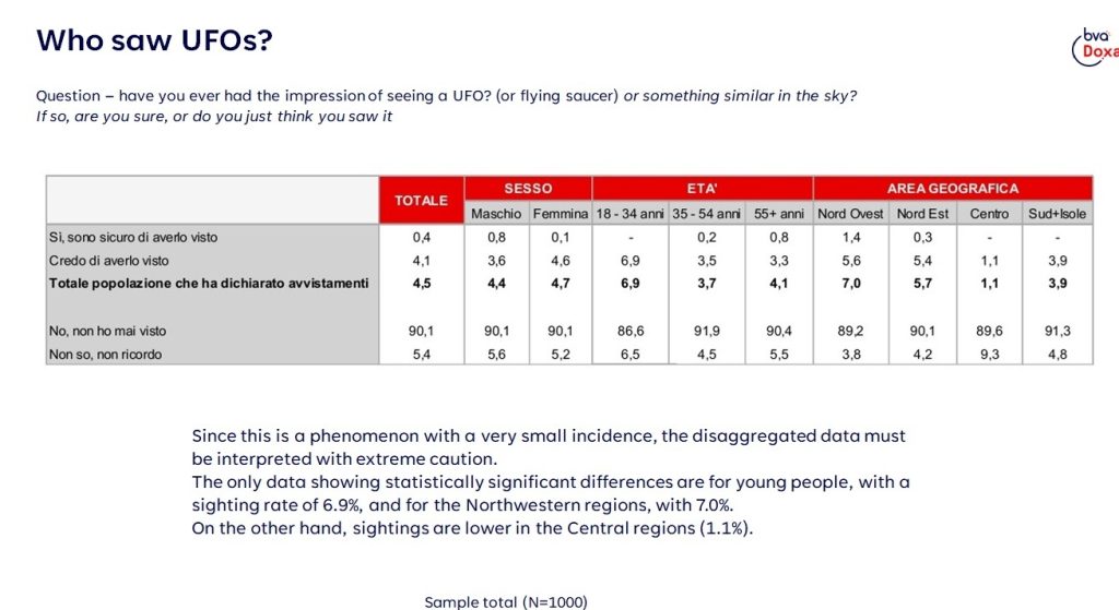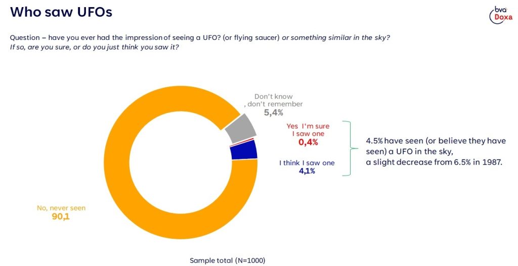 4.5% of the sample of adult citizens surveyed by the polling institute answered yes to the question “Have you ever had the impression of seeing a UFO (or flying saucer) or something similar in the sky?”