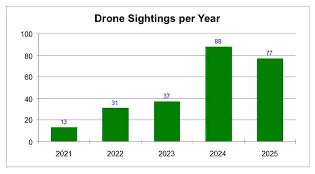 For the past five years, there has been a continuous increase in drone sightings, too. Private, industrial, agricultural, and police and rescue service drones are increasingly being mistaken for UFOs. This development reflects the rapid spread of unmanned aerial systems, as shown in the figure below.