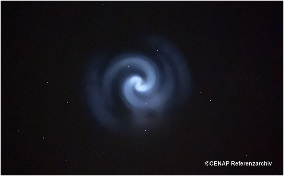 SpaceX's Starlink satellites are the main cause of the rising number of reports, with the distinctive Starlink train at the launch of a satellite batch continuing to cause confusion. However, other space-related phenomena also cause confusion. Re-entries of space debris, rocket stage ignitions in orbit, and burning debris are often reported as unexplained objects. A spectacular example occurred on March 24, 2025, when a rocket stage ignited over Germany and frozen fuel crystals glowed in the sunlight. This prompted numerous photos and videos to be taken. The following image shows one such phenomenon.