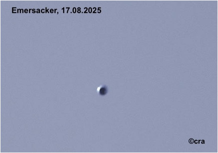 Of the 1,348 reports in 2025, only ten cases remained unsolved due to insufficient data. Two reports turned out to be deliberate hoaxes. As in previous years, no cases pointing to an exotic or extraterrestrial nature were recorded. In fact, supposed characteristics of anomalous objects can be found in identified sightings due to the perception and interpretation by witnesses. A notable example occurred in August 2025 when a Cessna 172 pilot passed a supposed "Mossul object" at a distance of only 15 meters over Bavaria (see figure below). This incident is commonly referred to as a "near miss." The explanation was a silver-colored tinfoil balloon at an altitude of 3,000 feet. Even experienced observers cannot classify everyday objects immediately.